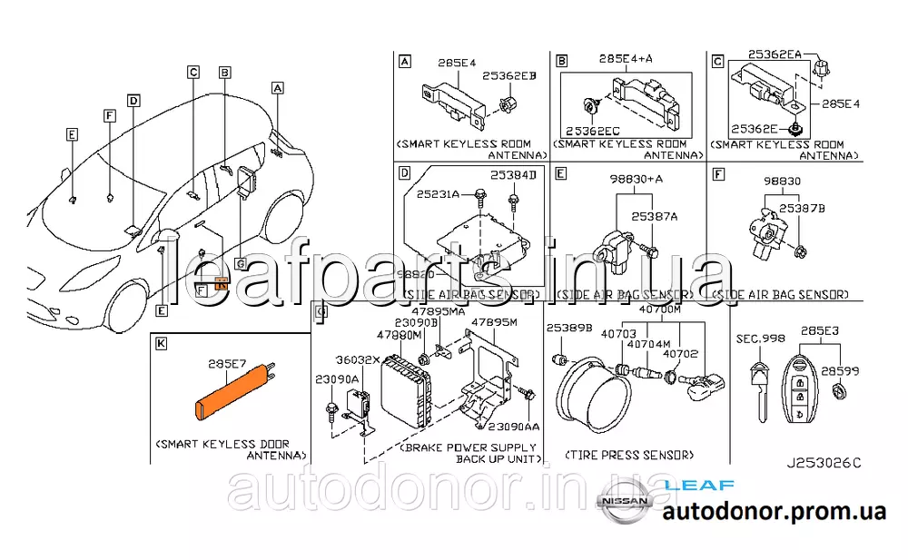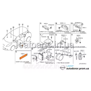 Антена бездротового замка передніх лівих дверей (ANTENNA ASSY-ROOM, SMART KEYLESS) на Нісан Ліф у кузові ЗЕ0 і АЗЕ0 з 2010 і до кінця випуску моделі електромобіля у 2017 році, Армада Ю62, Куб Зет12, Жук Ф15, Латіо Н17Ікс, Мікра К13, НВ200, Нот Е12, Пасфайндер Р52, Патрол Ю62, Квест Е52, Титан А61, Інфініті Джі 37, Джейкс, М, М,25, М М35, М37, М45, М56, К'ю50, К'ю60, К'ю70, К'юІкс56, К'юїкс 60, К'юїкс80.