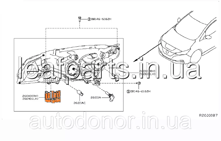 Кріплення лівого передньої фари головного світла на Нісан Ліф у кузові ЗЕ1 з 2018 року та після закінчення випуску моделі.