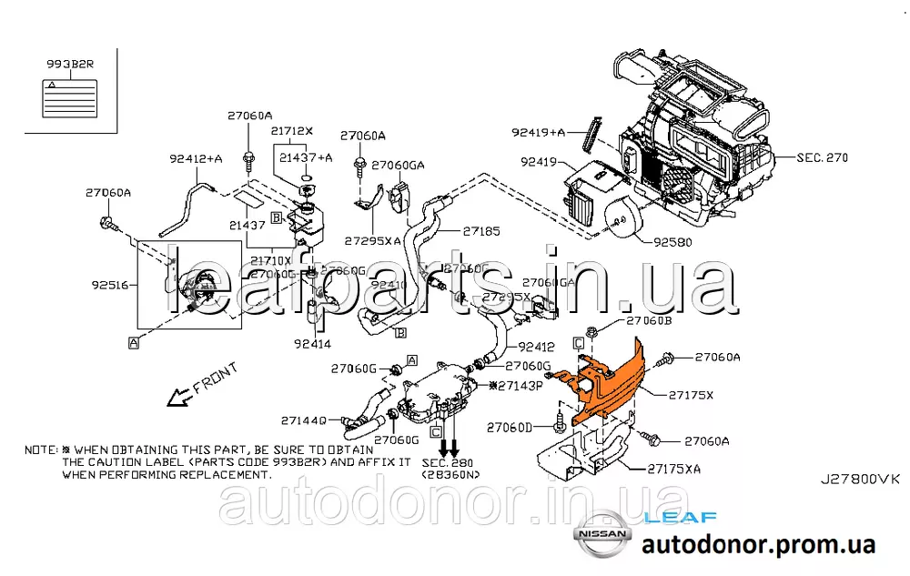 Кронштейн нагрівника печі верхній Nissan Leaf ZE0 (10-12) 27175-3NA0A