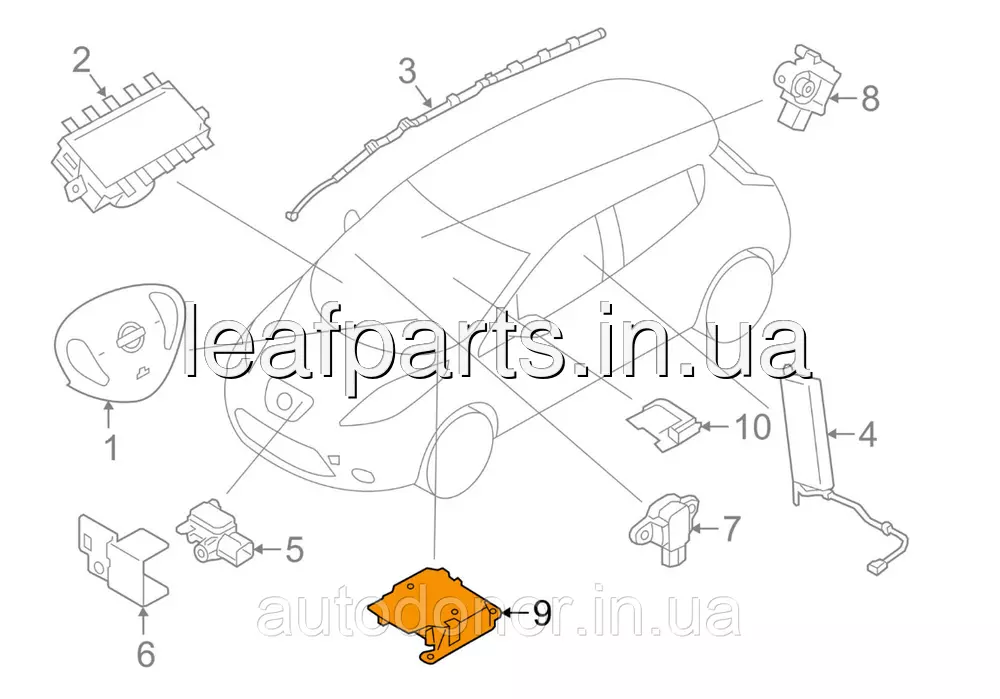Модуль srs airbag комп'ютер подушок безпеки (SENSOR-SIDE AIRBAG CENTER) на Ніссан Ліф в кузове ЗетЕ0 з 2010 до 2013 року.