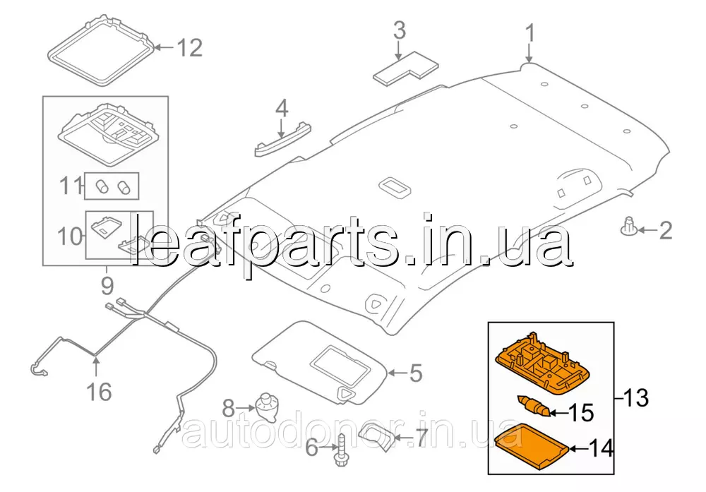 Плафон освітлення салону пасажирська сторона на Ніссан Ліф у кузові АЗЕ0 із 2013 по 2017 рік і ЗЕ1 з 2018 року після закінчення випуску моделі.
